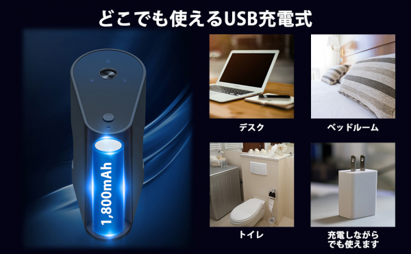 また本製品はUSB Type-CポートによるUSB充電式となっており、市販のUSB-ACアダプター(DC5V/1A)がご利用いただけます。本体には1,800mAhのリチウムイオンバッテリーを搭載しているため、電源が近くにない場所でも設置することができます。