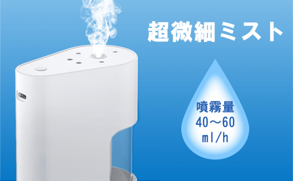 本製品は超微細なミスト状のアルコールを噴出します。噴出量は約40~60ml/hとなっており、一般的なポンプタイプのアルコールディスペンサーと比較して、噴出後に手がベタつきにくいのが特長です。ミスト状のため、設置場所の周囲が飛び散ったアルコールで汚れることもありません。本体サイズも高さ約10cmほどと非常にコンパクトなため、デスク周りやお手洗いなど、置き場所も選びません。身近なところに設置して、“こまめに消毒”をおすすめいたします。