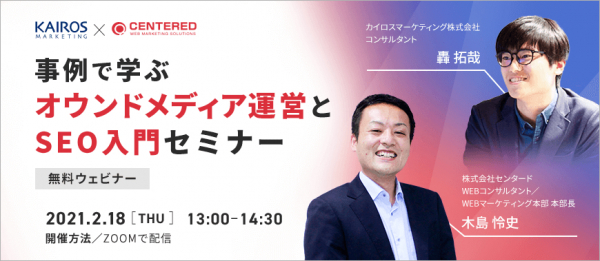 マーケティングオートメーション「Kairos3」を提供するカイロスマーケティング株式会社(本社:東京都渋谷区、代表取締役:佐宗 大介、以下「カイロスマーケティング」)は、2021年1月に実施した株式会社センタード(本社:東京都新宿区、代表取締役:平岡 悟、以下「センタード」)との共催セミナー「事例で学ぶオウンドメディア運営とSEO入門セミナー」が好評だったことを受け、2021年2月18日(木)に追加開催することを決定いたしました。