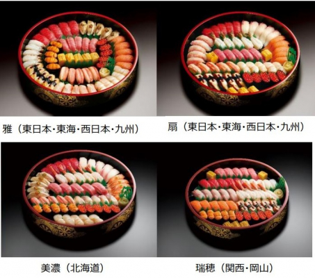 『駿河』は、販売エリアによってもネタに違いがあり、北海道エリア以外には、マグロ・真イカ・サーモン・ハマチ・甘エビ・本ズワイガニ・エンガワ・うなぎ・鮭いくら(関西はキュウリいくら)・ネギトロ・鉄火巻・切玉子が、北海道エリアではうなぎがソイ昆布〆に替わります。