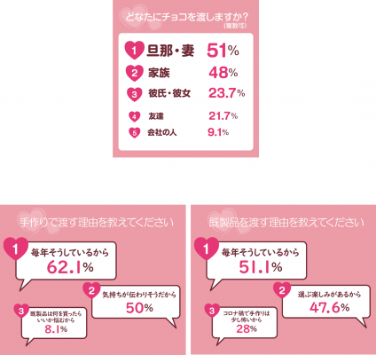 チョコを渡すお相手は旦那さん、家族、彼氏、友達、会社の人で、手作り派も既製品派もその割合はほぼ同数でした。