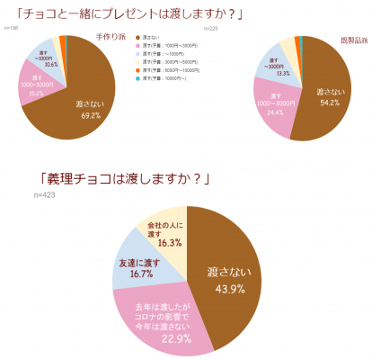 「義理チョコは渡しますか?」という質問には、「渡さない(43.9%)」の次に「去年は渡したが、コロナの影響で今年は渡さない(22.9%)」人が多い結果となりました。