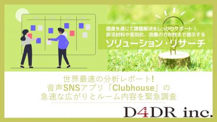 ディー・フォー・ディー・アール株式会社(本社:東京都港区、代表取締役社長:藤元健太郎、以下D4DR)は、自社サービスの1つである「ソリューションリサーチ(課題解決にむけた調査)」のノウハウを生かし、現在急速に注目度が上がっている音声SNSアプリ「Clubhouse」の調査を行い、その結果を発表しました。