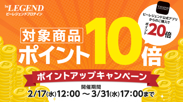 プロテインで初めてモンドセレクション最高金賞を6年連続受賞しているビーレジェンドプロテインを展開する株式会社Real Style(本社:奈良県大和高田市、代表取締役:鍵谷 健、以下弊社)は2021年2月17日(水)12:00から3月31日(水)17:00まで、「ポイントアップキャンペーン」を開催します。