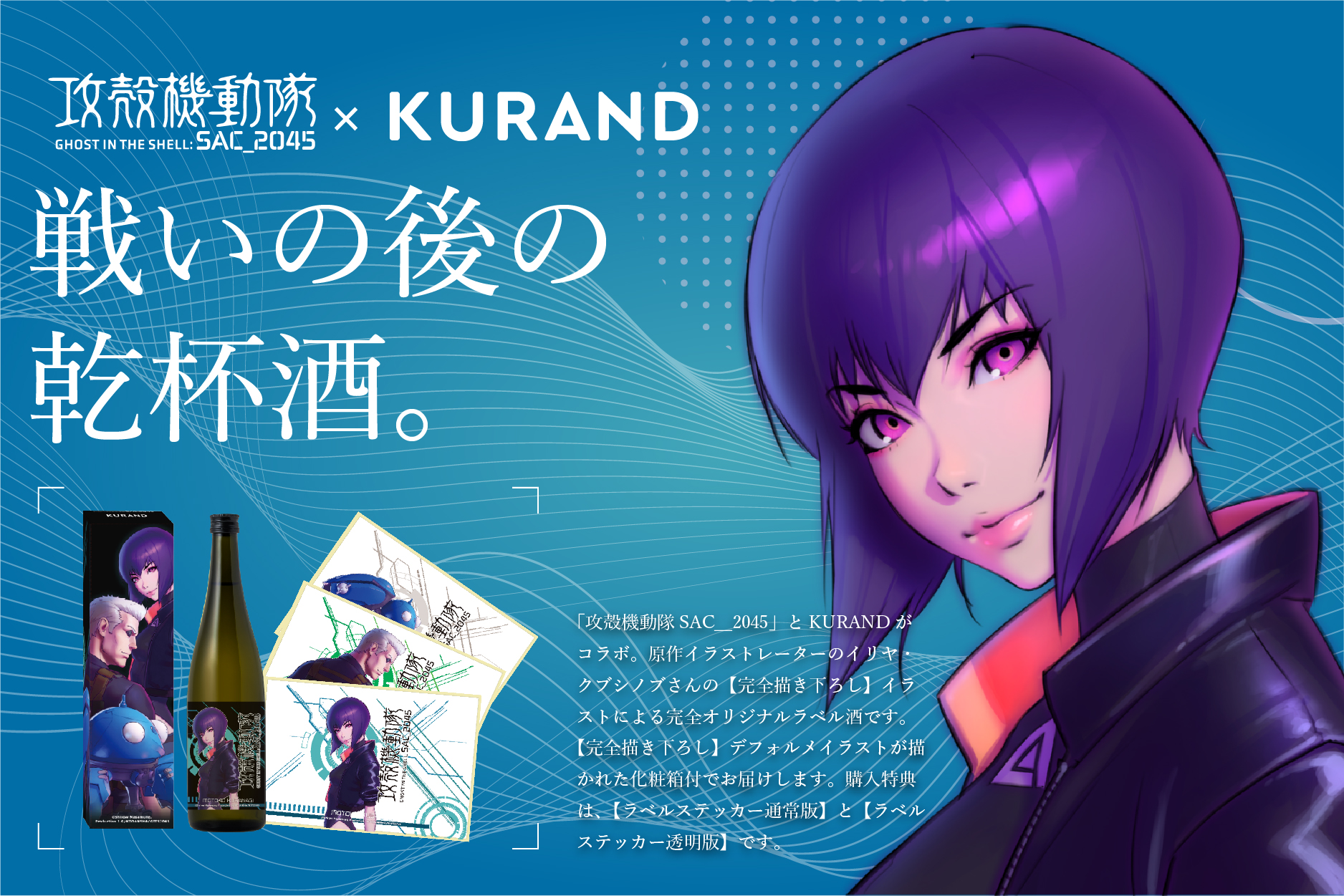 リカー・イノベーション株式会社(本社:東京都足立区、代表取締役:荻原恭朗)は、弊社が運営するお酒のオンラインストア「KURAND(クランド)」にて、NETFLIXオリジナルアニメシリーズ「攻殻機動隊 SAC_2045」とコラボしたオリジナルラベル日本酒「GHOST IN THE SHELL: SAC_2045」を、2021年3月3日(水)17:00より、KURANDオンラインストア特設ページにて期間限定で先行販売を開始します。(https://products.kurand.jp/ghostintheshell-sac2045 ※3月3日(水)17:00より同時公開)
