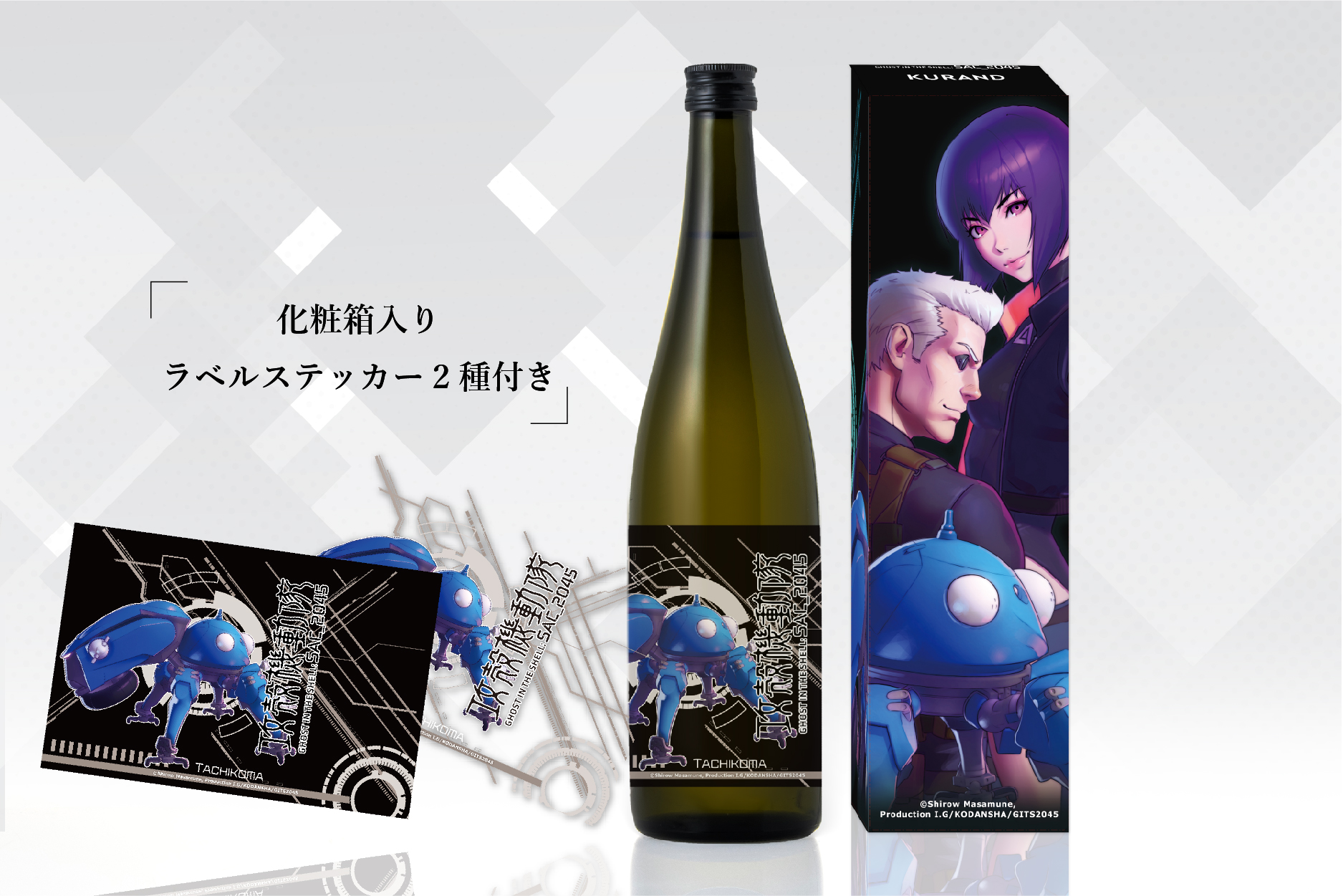 「GHOST IN THE SHELL: SAC_2045」とは、NETFLIXオリジナルアニメシリーズ「攻殻機動隊 SAC_2045」と「KURAND」のコラボレーションによる、オリジナルラベルのお酒です。「攻殻機動隊 SAC_2045」の原作イラストレーターのイリヤ・クブシノブ氏の【完全描き下ろし】による、作中のキャラクター3体「草薙素子」「バトー」「タチコマ」のイラストが描かれた完全オリジナルラベルです。描き下ろしイラストが描かれた化粧箱付でお届けします。購入特典として、【完全描き下ろし】ラベルステッカーをお付けします。2021年3月3日(水)17:00からの「KURAND」オンラインストアでの先行販売でご購入された方には先行販売特典として【完全描き下ろし】ラベルステッカー先行販売特別版をお付けした2種類をお付けします。