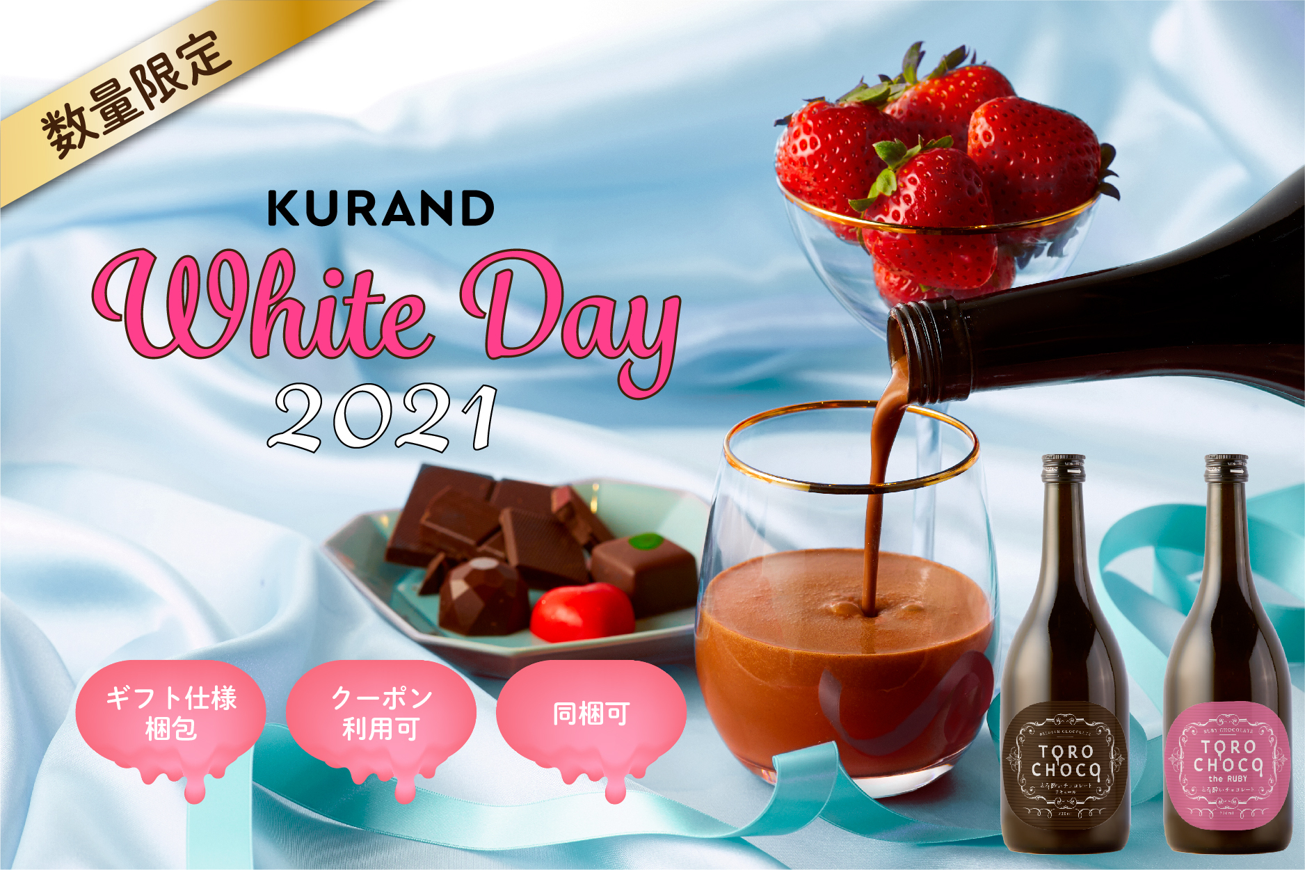 リカー・イノベーション株式会社(本社:東京都台東区、代表取締役:荻原恭朗)は、 今話題の”酔う”チョコレートリキュール「TOROCHOCO」「TOROCHOCO the RUBY」を、弊社が運営するお酒のオンラインストア「 KURAND(クランド)」にて、2021年2月23日(火)~3月20日(土)で数量限定でホワイトデー仕様で販売します。(https://kurand.jp/pages/whiteday)