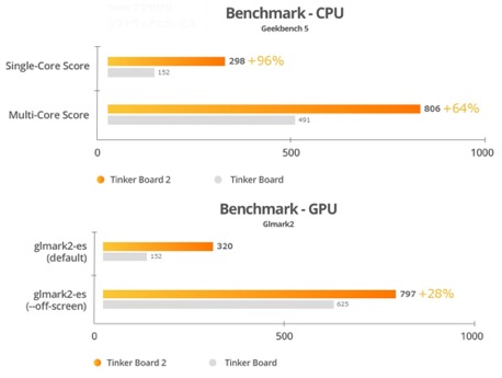 特にMulti-Core SourceでのCPU パフォーマンスは、初期型のTinker Boardと比較して+96%と大幅に改善改善しています。また、GPUもARM(R)MaliTM-T860MP4 GPU@800MHzを採用。同様に+28%向上しています。