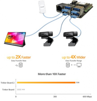 Tinker Board 2では、従来機のUSB2.0の4ポートから、搭載された3つすべてのUSBボート(Type-A)がUSB3.2に対応し、更にType-Cのポートが1つ搭載され、伝送速度が大きく改善した他、USBの給電性能もType-Aポートが0.9A、Type-Cポートが1.5Aに向上しています。