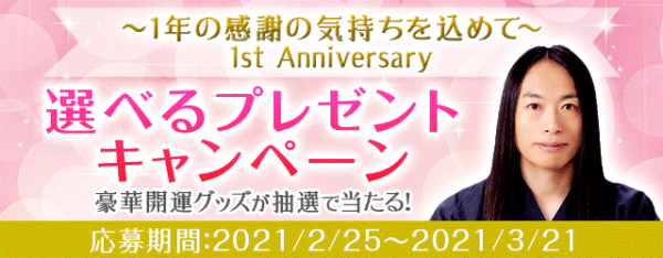 3月2日に月額公式サイト『ラブちゃんの占い』がサイトリリース1周年を迎えました。これを記念し、『1年の感謝の気持ちを込めて 選べるプレゼントキャンペーン 豪華開運グッズが抽選で当たる!』キャンペーンを実施いたします。