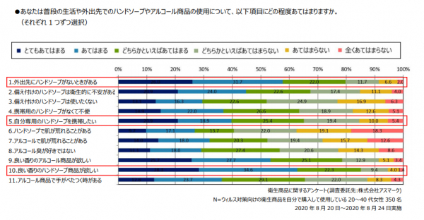 350 名を対象に衛生商品に関するアンケートをおこなった結果、「外出先にハンドソープがないときがある」と回答した方は全体の約 80%、「自分専用のハンドソープを携帯したい」と回答した方は約 65%、「良い香りのハンドソープ商品が欲しい」と回答した方が 85%を超える結果となりました。