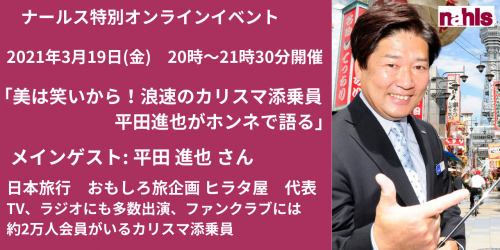 今回、スペシャルトークイベントとして、浪速のカリスマ添乗員として有名な平田進也さんお迎えして、「美は笑いから!浪速のカリスマ添乗員 平田進也がホンネで語る」を開催します。