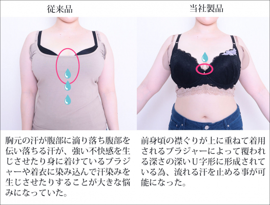 胸元の汗が腹部に滴り落ち腹部を伝い落ちる汗が、強い不快感を生じさせたり身に着けているブラジャーや着衣に染み込んで汗染みを生じさせたりすることが大きな悩みになっていた。
