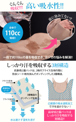 ゴールドジャパンの開発により発汗により身体の肌に生じた汗を肌着素材に本来的に備わっている吸湿性(吸汗性)による汗取り作用に加えて、肌着素材自体によって発揮される汗取り作用を補完することができる「汗取り機能」や、汗がブラジャーやブラウスなどの上着に染み込んで汗染みの原因になることを防ぐという「汗止め機能」を発揮する汗取り汗止め用インナーとして多くの女性の悩みを解決する商品となっている。
