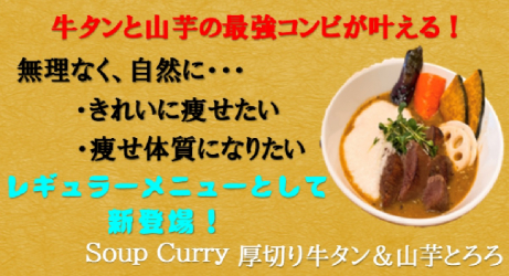 コロナ禍により外出を控えている人も多いと思いますが、家にこもっているとウエイトコントロールに気を使うのではないでしょうか。牛タンはそうした人にぴったりの食材だと考えます。無理せず自然に「きれいに痩せたい」「痩せ体質になりたい」という願望のある人へ、下記のような栄養素を摂取できる「スープカレー・厚切り牛タン&山芋とろろ」をおすすめします。
