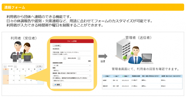 利用者から管理者への連絡ができる機能です。利用者は管理者が設定したフォームへの入力が可能です。日付ごとに入力を管理できるカレンダー形式と、日付に関係なく入力ができる自由形式の2種類があり、カレンダー形式では体調報告や遅刻・欠席連絡として、自由形式は団体への問合せフォームなどとして利用できます。