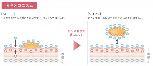 肌表面がマイナスイオン化することでその反発力により汚れだけを剥離洗浄します。