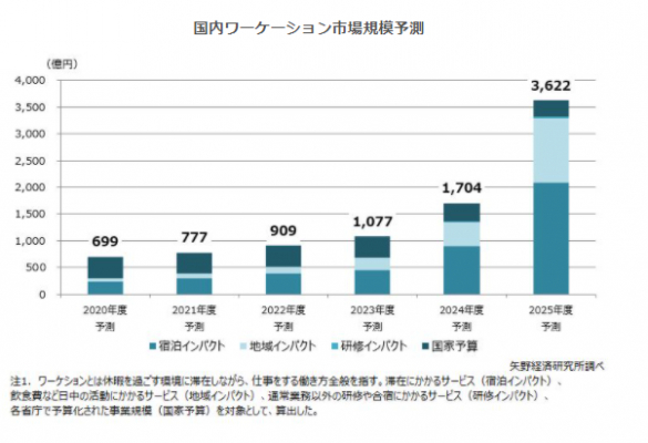 ワーケーション(workation)とは、仕事(work)と休暇(vacation)を組み合わせた造語である。ワーケーション市場は、これまでテレワークに場所の裁量が認められる人や、いわゆるノマドワーカー(オフィスではなく喫茶店やコワーキングスペースなどさまざまな場所で働く人)と呼ばれる人たちで形成されていたごく一部の市場であった。しかし2020年のコロナ禍を契機に、一気に多くの企業でテレワークが普及し、ニーズが拡大した市場といえる。2020年度の国内ワーケーション市場規模を699億円と予測する。