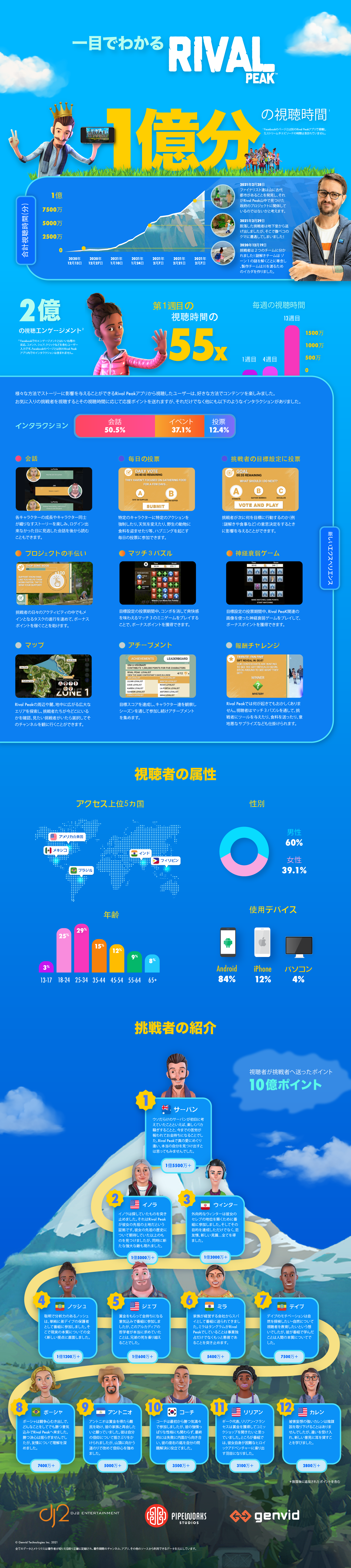 Genvid Technologies,Inc.、Pipeworks Studios、DJ2 Entertainmentは、Facebookのインタラクティブ・コンテンツRival Peak (https://www.facebook.com/RivalPeak:2020年12月2日~2021年3月3日配信)が、12週間に渡るFacebook上の配信での視聴時間が1億分以上に達したことを発表し、今年最大級のインタラクティブ・イベントになるのではと注目されています。