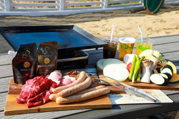 全体的に白を基調とした施設では、砂が敷き詰められたエリアや屋根付きのエリアにて、グリルバーベキューが楽しめます。
