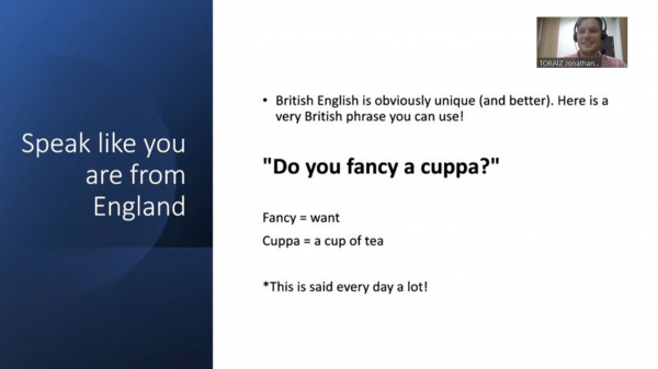「Dream Now, Travel Later」第10弾はイングランドをご紹介しました。イギリス出身のネイティブコーチがツアーガイドを担当し、約50分間のイベント中すべて英語でプレゼンテーションやクイズを行い、29名の参加者と質疑応答を交わしました。イギリスの有名な観光スポットをはじめ、イギリス人には欠かせない紅茶やブリティッシュパブなど食文化についても幅広く紹介しました。最後の質疑応答の場面では、参加者が次々に英語で質問をし、TORAIZのコーチング式のレッスンや学習で身につけた「英語を話す」積極性を発揮されました。