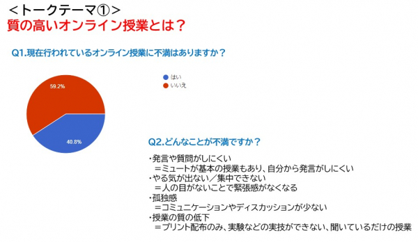 いずれも事前に学生95名にアンケートを取り、まとめたデータをもとに議論が進められた。それぞれのテーマで参加者から出た意見は次のようなものでした。
