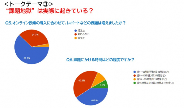 課題が増えたのは間違いない。特にオンデマンド授業は学生の出欠確認ができないので、出席数での評価ができない。学習の進み具合を確認するためにレポートの提出が求められることが増えた。「地獄」というほどではないが、オンライン授業が始まる以前より多くなったことは確実。(Sさん・拓殖大学)