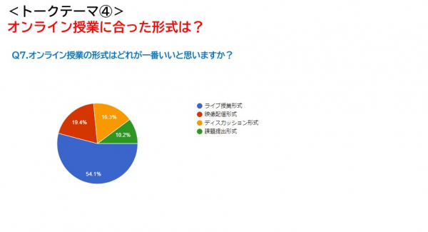 A4.一般教養、基礎知識などの座学はオンライン授業・オンデマンド配信に合っている。実習やディスカッションなど、教員と学生のコミュニケーションが重視される授業はオフラインが良い。オンライン授業に使うツールやソフトウェアの発達によって解消されていく部分もあるだろう。