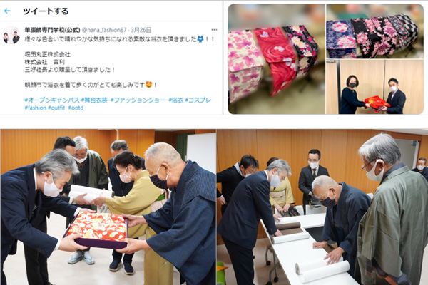 ■<画像上部上>3/25(木)学校法人華学園 華服飾専門学校 教務部 就職担当 神谷様にご来社頂き、弊社代表取締役社長の三好より浴衣を寄贈させて頂きました。更に、公式ツイッターにも取り上げて頂きました。