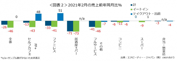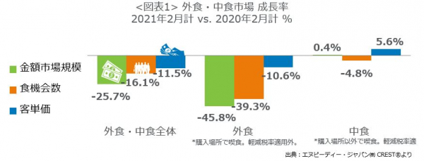 外食・中食市場情報サービス『CREST(R)*1』を提供するエヌピーディー・ジャパン株式会社(東京都港区、クリストス・クリストフォロー代表)は、外食・中食市場2021年2月の動向分析レポートを2021年4月7日に公表します。