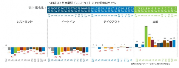 外食業態計(レストラン計)の売上前年同月比を利用形態ごとにみてみると(図表3)、出前の大幅増が続いており、4月は28%増、5月は204%増、6月は104%増、7月は75%増、8月は23%増、9月は44%増、10月は39%増、11月は68%増、12月46%増、1月63%増で、2月も72%増と2桁成長が続いています。