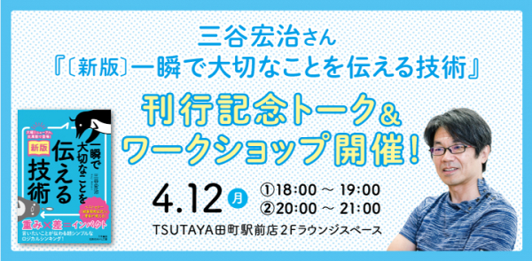 『〔新版〕一瞬で大切なことを伝える技術』(知的生きかた文庫/三笠書房)の刊行を記念して、著者の三谷宏治さんによる刊行記念トーク&ワークショップが開催されます!