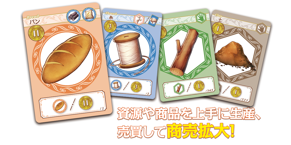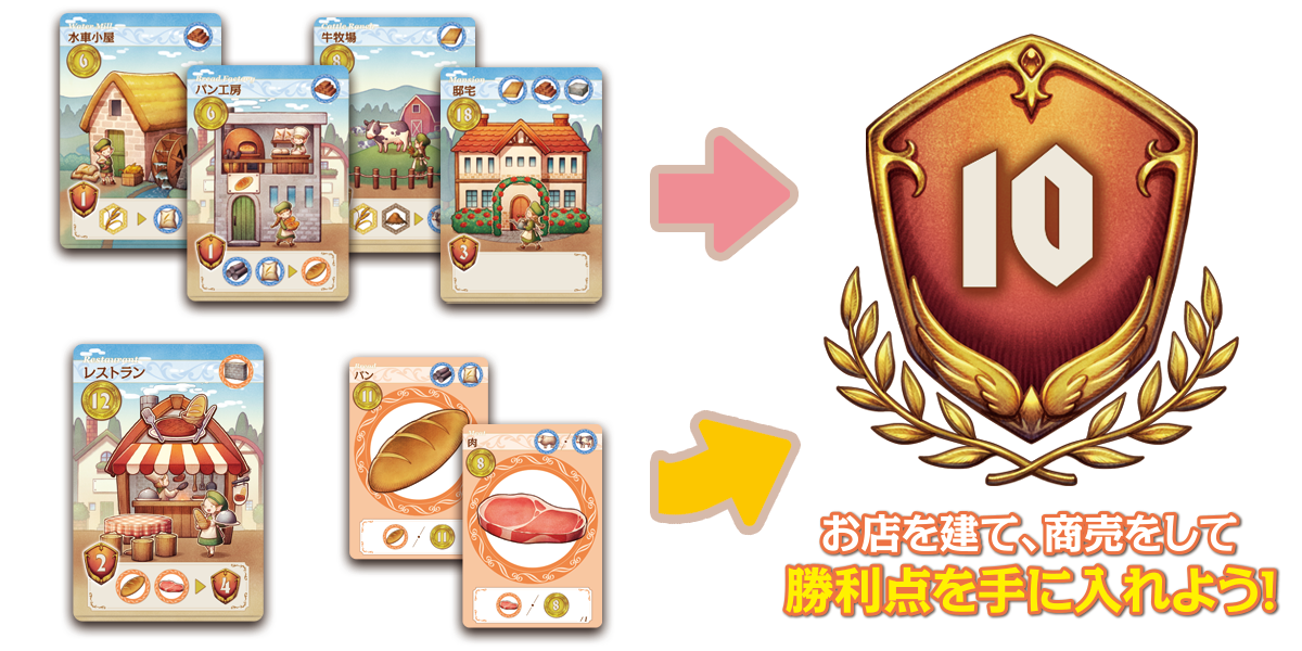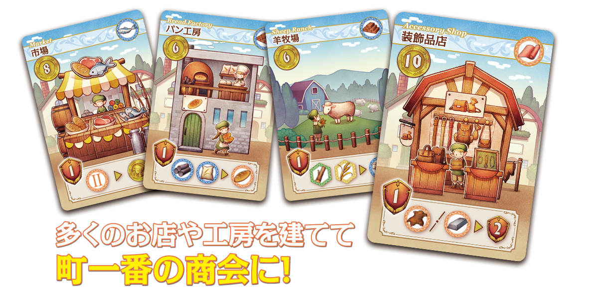 自分のお店や工房を建てたり、建てたお店の効果を使って、勝利点を誰より早く10点以上手に入れたプレイヤーに栄冠が輝きます! あなたも“町一番の商会”をめざし、ブラウニーたちと商会経営をはじめましょう!
