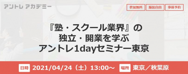 株式会社アントレ様(https://corp.entrenet.jp/)は、起業・開業への準備から、独立後の運営、収支の見込みまでを支援する会社。今回開催するのは『塾・スクール業界』の独立・開業を学ぶセミナーです。城南コベッツは、セミナープログラム「【企業説明会】働き方を学ぶ比較ツアー」「個別相談会」へ参加し、学習塾情報などをお伝えする予定です。
