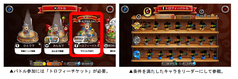 上記期間中「トロフィーバトル」の参加に必要なチケットが、“ひとりで”“みんなで”共に各3→10枚に増量します。