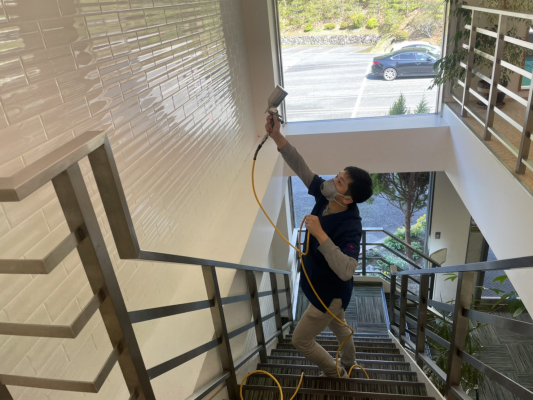 『ナノディフェンダーAg+(ナノディフェンダーエージープラス)』は銀イオン配合により、光が届きにくい箇所にも効果を発揮できることや体育館・大ホールやタクシー会社などへの施工実績があること、施工が他社と比較して安価であることまた、新型コロナウイルスの不活化効果実証実験エビデンス・殺菌効力分析試験の効果エビデンスなど総合的に検討され、導入していただきました。銀系光触媒コーティング済みの場所には、施工済みステッカーを貼り付け、来客の方への目印を設置しています。