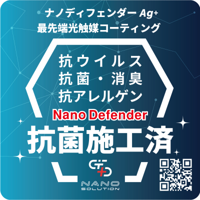 3月に新型コロナウイルスの不活化効果実証実験エビデンス取得済み製品で本試験品を使用することにより、表面についた新型コロナウイルスによる接触感染防止に有効である可能性が考えられたとプレスリリース配信済みである。また従来の光触媒は光を必要とするため、光の当たりにくい場所での抗ウイルス・抗菌効果が1番の課題でした。『ナノディフェンダーAg+( https://nanosolution.jp/nanodefender/ )』は、銀イオンを配合したことで光が当たりにくい場所や夜間でも効果を発揮するよう開発した改良新製品です。殺菌効力分析試験においても、大腸菌・サルモネラ・カンジタ・白癬菌・肺炎桿菌など殺菌率が99.9%と試験結果で出ました。 本試験品を使用することにより、表面についた菌を不活化させることが実証されました。光触媒コーティング施工に関しては養生が不要で、風合いを一切変えずに実施でき、1回の施工で3~5年にわたり24時間抗ウイルス・抗菌効果を持続します。