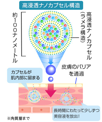 プロテオグリカンを始め、厳選された成分で出来た濃厚な美容液を、浸透ナノカプセルに閉じ込める事で水溶性の美容液を角質層までしっかりと届け、多重層で出来たカプセルが、美容液を長時間にわたり放出する事で、お肌に潤いを与え続けます。