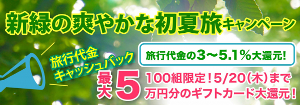 前回の「春のさくら満開キャンペーン」に引き続き、最大5.1%(一人あたり最大5万円分)の還元率となる大変お得なキャンペーンとなっております。「日本船・日本発着クルーズ(飛鳥II、にっぽん丸、ぱしふぃっくびぃなす)2021年4月~10月」をご予約されたお客様へ、100組限定で旅行代金の3~5.1%をAmazon(電子)または、JCBギフトカードで還元させていただきます。また、ベストワン国内旅行サービスとして、「国内ツアー」、「国内ダイナミックパッケージ」、「バスツアー」、「宿泊(ホテル・旅館)」等をご予約のお客様にも100組限定で、旅行代金より3.1%還元させていただきます。5月20日(木)までの期間限定のキャンペーンとなりますので、是非、この機会にご利用いただきお得に旅行をお楽しみください。