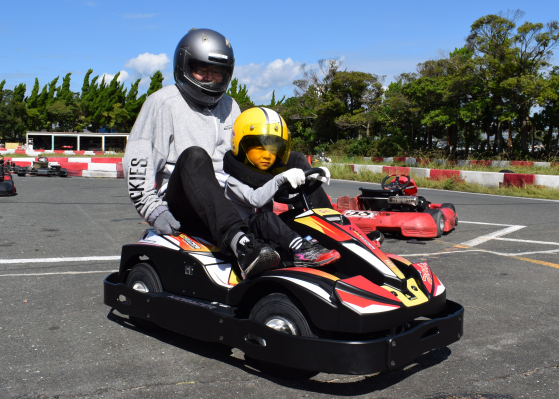 安全面については、2歳から3歳のお子様は保護者が同乗し後ろでサポート、4歳以上のお子様にはヘルメットを装着して頂くほか、お子様の体格に合わせて速度を調整可能です。さらにコース上にはバリケードを設置していますので、安心して楽しむことが出来ます。