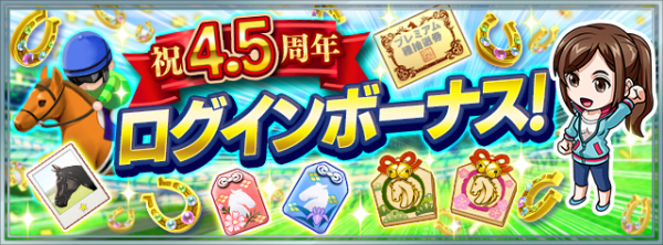 2021年5月1日(土)00:00から2021年5月31日(月)23:59までの期間にダビマスへログインすると、4.5周年特別プレゼントとして、金の馬蹄石450個をプレゼントします!