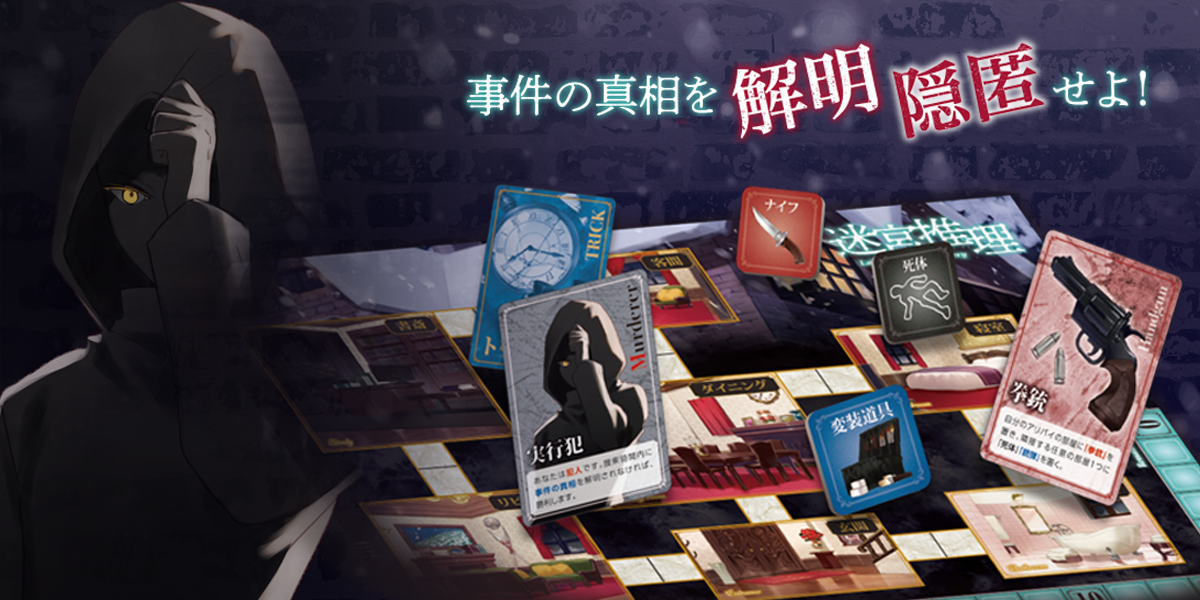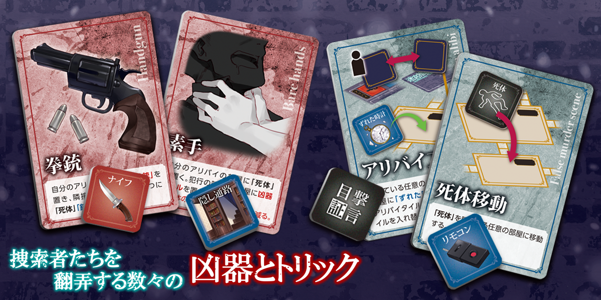 プレイヤーたちは捜索者となって館の中を捜索。証拠を集めて自分たちの中に潜む犯人を見つけ出します。時間内に犯人の正体、凶器とトリックを暴き、事件の真相を解明できれば勝利しますが、逆に隠匿しきれば犯人プレイヤーが勝利します。真相を解明/隠匿する者、勝利するのはどちらでしょうか。