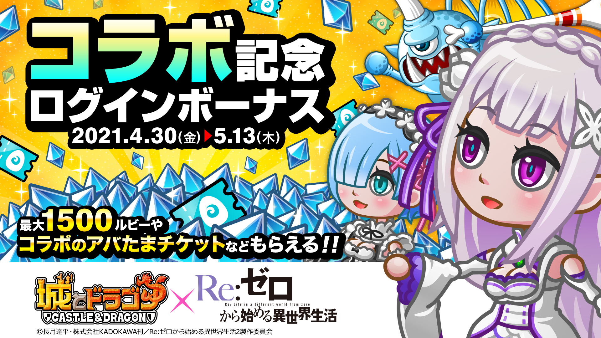 『Re:ゼロから始める異世界生活』とのコラボイベント開催を記念して、最大1500ルビーや“コラボのアバたまチケット”などがもらえるログインキャンペーンを開催いたします。期間中、ゲームにログインすると最大14日間、豪華報酬が1日1回もらえます。