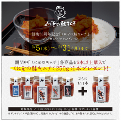 「くにをの鮭キムチ 公式オンラインショップ」( http://shop-kuniwo-kimuchi.com )にて商品を5本以上ご購入される方に、「くにをの鮭キムチ 250g」を1本プレゼント。