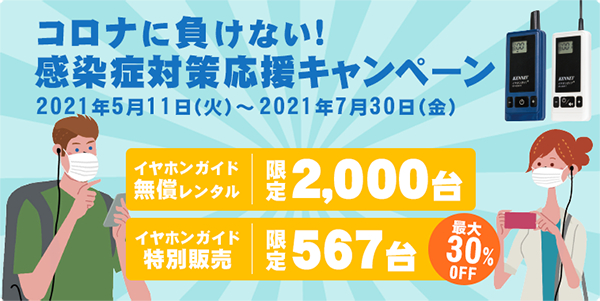ガイドレシーバー「イヤホンガイド(R)」をツーリズム業界中心に展開する株式会社ケンネット(本社:東京都中央区 代表取締役社長:上田 雄太/以下 当社)は、「コロナに負けない!!感染症対策応援キャンペーン」を2021年5月11日より開始いたします。