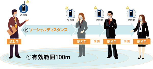 マスク越しでも約100m離れた相手まで声を届けることが出来る(上記(1))ことから、ソーシャル・ディスタンスを確保し(上記(2))」、感染リスクを低減する「新生活様式の必需品」として、教育旅行やイベント、施設見学等を主催する企業・行政団体に積極的な利用をご提案しております。
