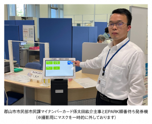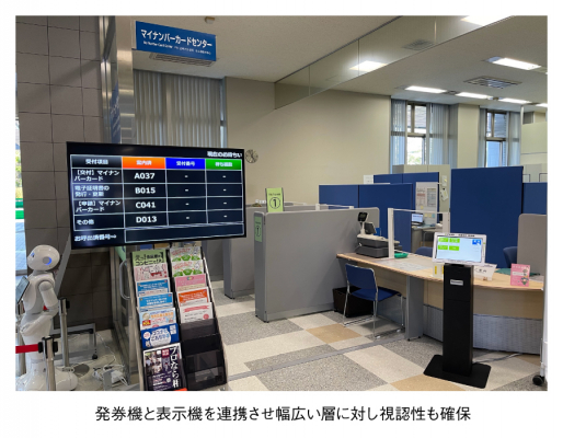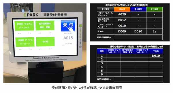 2021年4月12日よりマイナンバーカードセンターの9つの窓口に対して、来庁者向けにはEPARK順番待ち発券機を1台と番号案内用表示機(モニター)を2台設置し、職員側にはEPARK端末4台を連携して運用している。