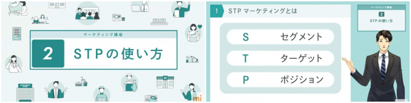 深くマーケティングを行うための手法を事例を交えて解説しますので、具体的なスキルを習得できます。また最後まで飽きずに視聴してもらえるよう、アニメーション形式になっているのも特徴です。
