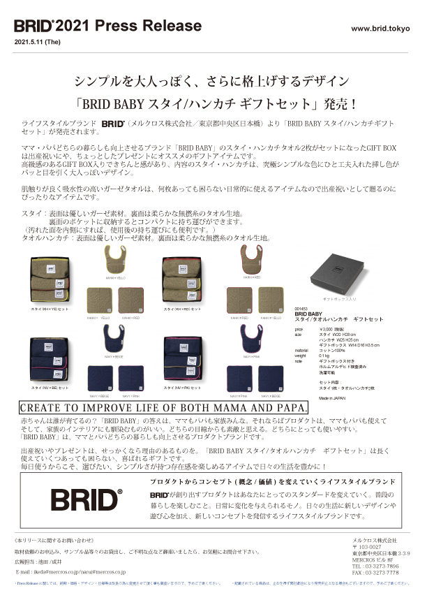 ライフスタイルブランドBRID(メルクロス株式会社/東京都中央区日本橋)より5月14日「BRID BABY スタイ/ハンカチギフトセット」が発売です。ママ・パパどちらの暮らしも向上させるブランド「BRID BABY」のスタイ・ハンカチタオル2枚がセットになったGIFT BOXは出産祝いや、ちょっとしたプレゼントにオススメのギフトアイテムです。