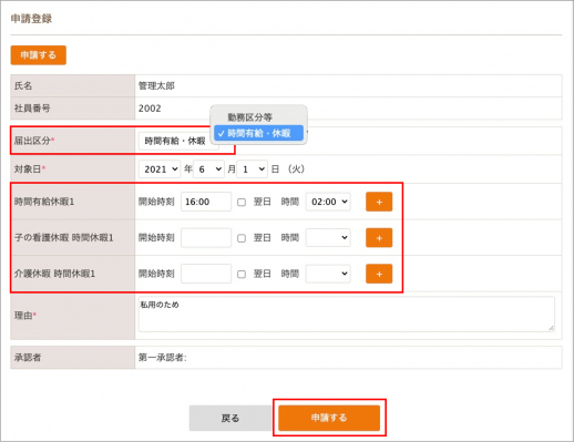 時間有給休暇などの登録項目が表示されますので「開始時刻」と「時間」を登録して「申請する」ボタンをクリックします。